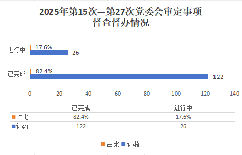 2025年6月12日至11月27日,期间共召开了13次党委会议,党政办公室对其中148项审定事项进行了跟踪督办,按照事项、负责部门进行分类,并与相应责任单位逐一核实,向30个单位下发了督查督办通知,要求根据党委会审定情况报送落实情况。经统计,148项事项中,已完成122项,占总比率82.4%;进行中26项,占总比率17.6%。(见下图)。