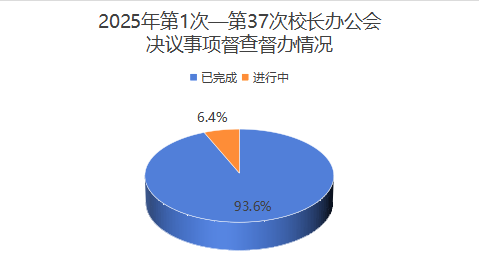 2025年1月6日至12月22日,期间共召开了37次校长办公会,党政办公室对其中406项决议事项进行了跟踪督办,按照事项、负责部门进行分类,并与相应责任单位逐一核实,向42个单位下发了督查督办通知,要求根据校长办公会决议情况报送落实情况。经统计,406项事项中,已完成380项,占总比率93.6%,进行中26项,占总比率6.4%(见下图)。